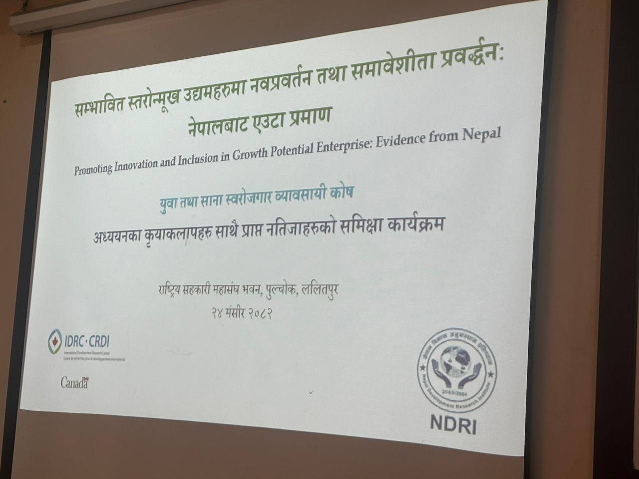 नेपाल बिकास अनुसन्धान प्रतिष्ठान (NDRI) द्वारा कोषका उपाध्यक्ष अनिलराज पौडेल, NDRI का अध्यक्ष लगायत अन्य टिम र कोषका अन्य कर्मचारी समक्ष NDRI द्वारा अध्ययन गरि तयार पारिएको कोषको अध्ययनका कृयाकलापहरु साथै त्यसबाट प्राप्त नतिजाहरुको प्रस्तुतीकरण एवम छलफल |